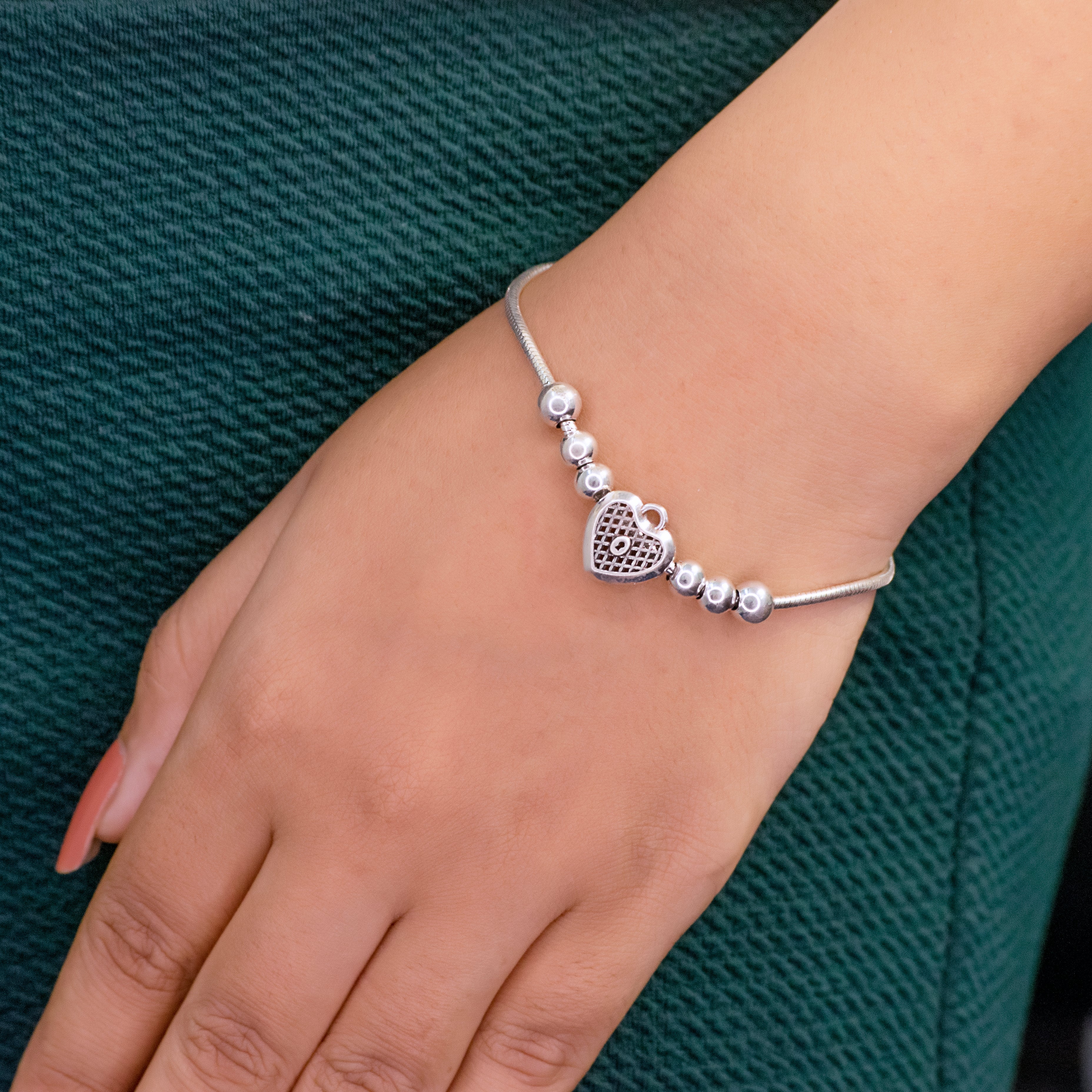 Add a touch of timeless charm to your wrist with this 925 Pure Silver Heart Charm Bracelet. Expertly handcrafted with lustrous silver beads and a detailed heart-shaped charm, this bracelet perfectly blends elegance with simplicity.