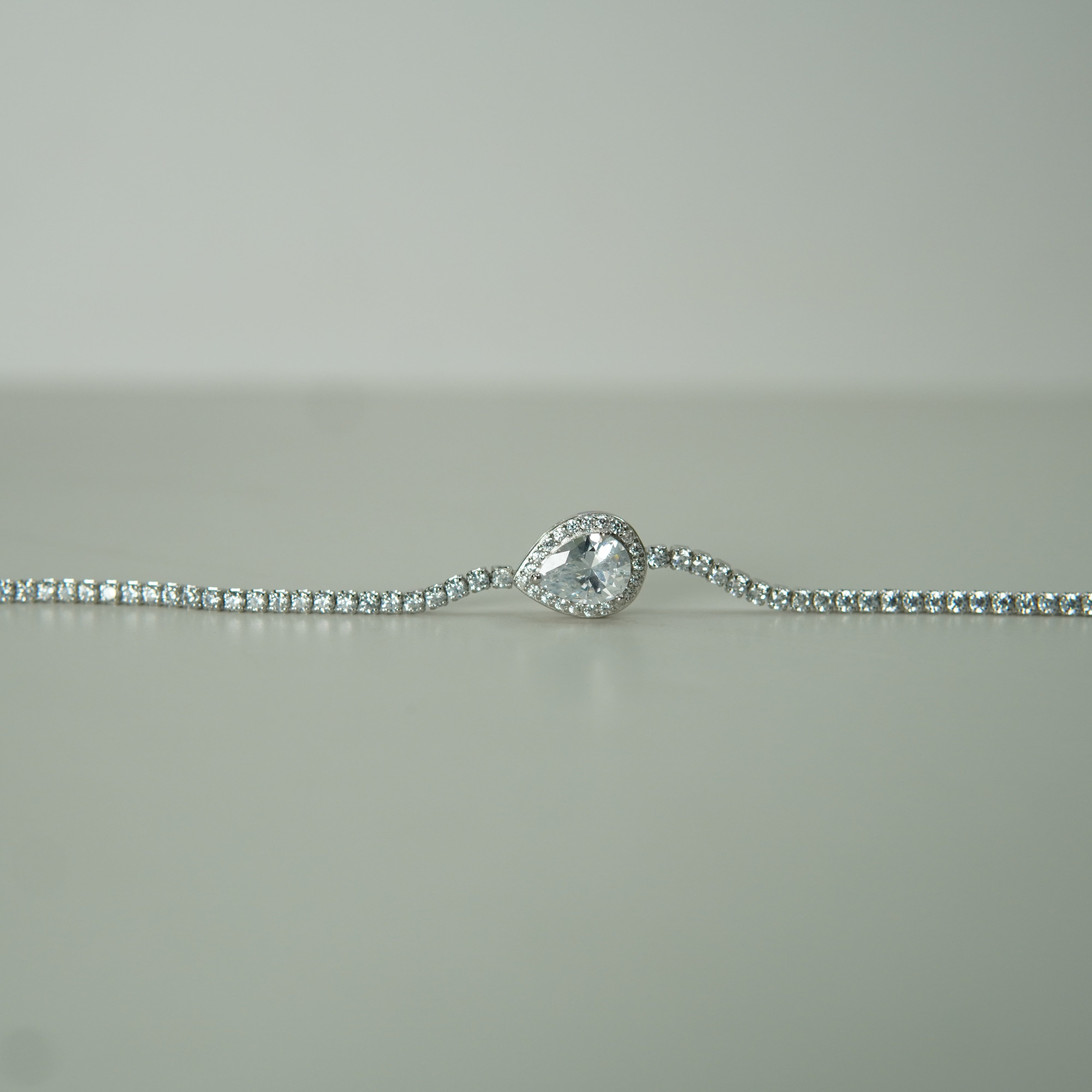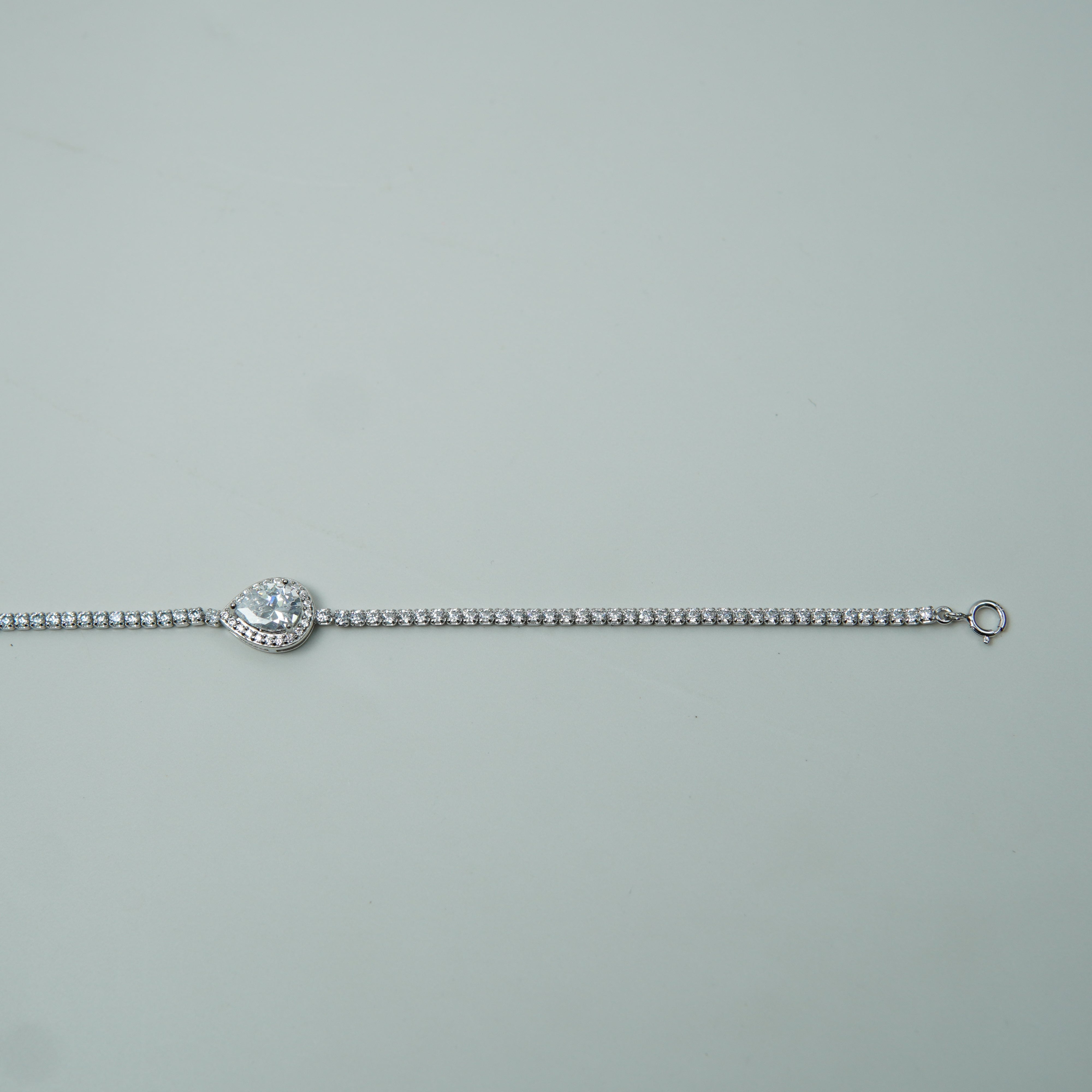 Elegant and timeless, this Silver Teardrop Zircon Tennis Bracelet exudes refined sophistication. Crafted from high-quality sterling silver, it features a delicate line of shimmering zircon stones that sparkle beautifully with every movement. At its center lies a stunning teardrop-shaped zircon crystal, surrounded by a halo of smaller stones that enhance its brilliance and add a touch of luxury.