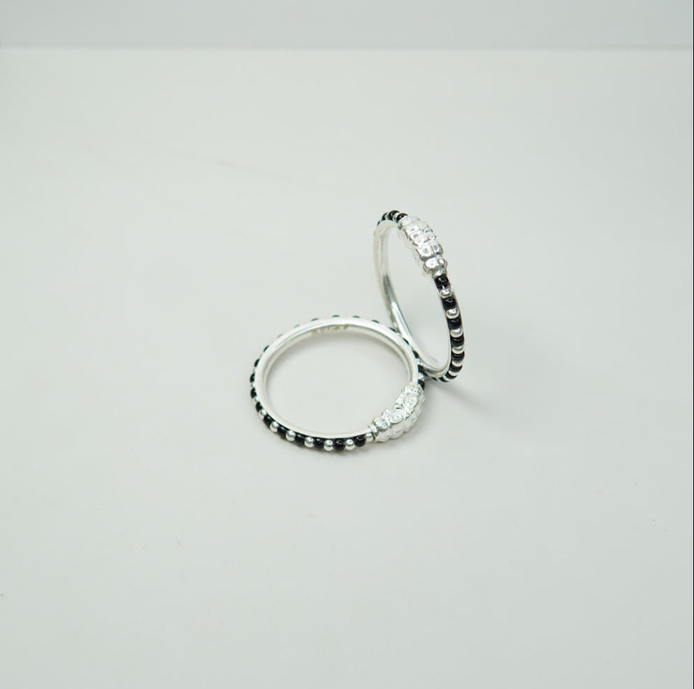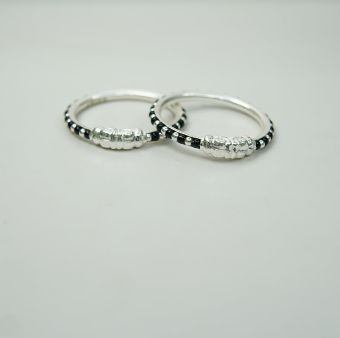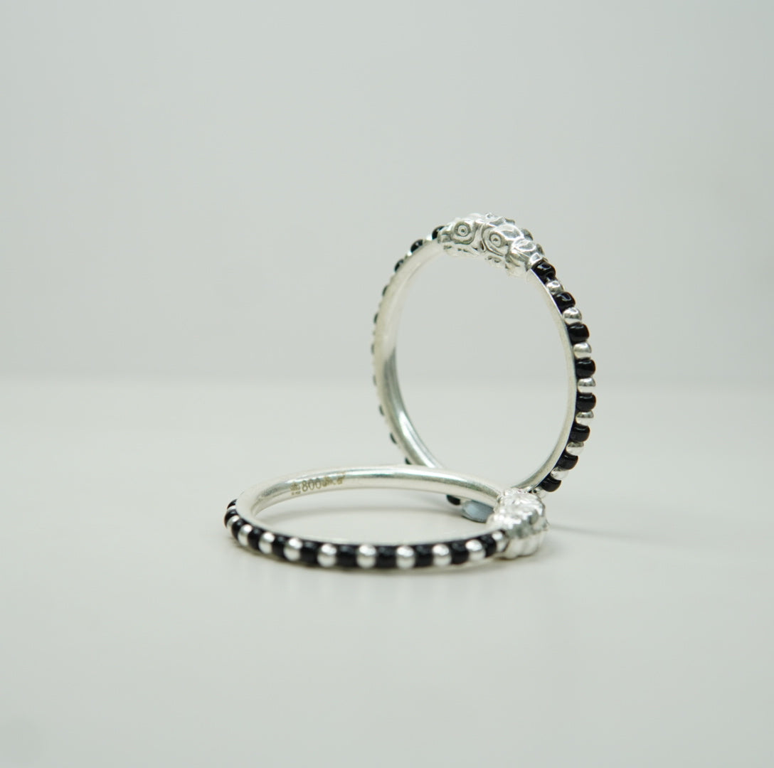 These elegant bangles are handcrafted from high-quality sterling silver and adorned with classic black beads, traditionally known as "nazariya" beads. Worn by babies and toddlers, these bangles are believed to offer protection against the evil eye and bring good luck, health, and positivity. The contrasting black beads and luminous silver create a timeless, minimal, and culturally significant accessory.