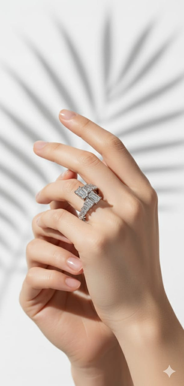 Elegant, minimal, and eye-catching — this 925 sterling silver ring features a modern wrap-around design, beautifully set with sparkling clear gemstones. The mix of rectangular and square cuts creates a unique geometric look, perfect for adding sophistication to both casual and formal outfits.