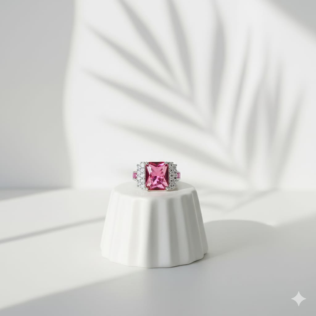 Turn heads with this stunning sterling silver ring, featuring a bold princess-cut pink gemstone at its center. Surrounded by shimmering accent stones, this ring combines glamour with elegance, making it perfect for both daily wear and special occasions.