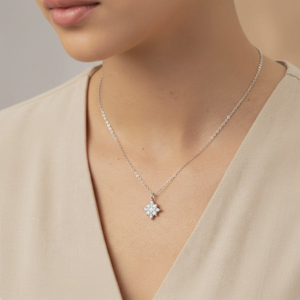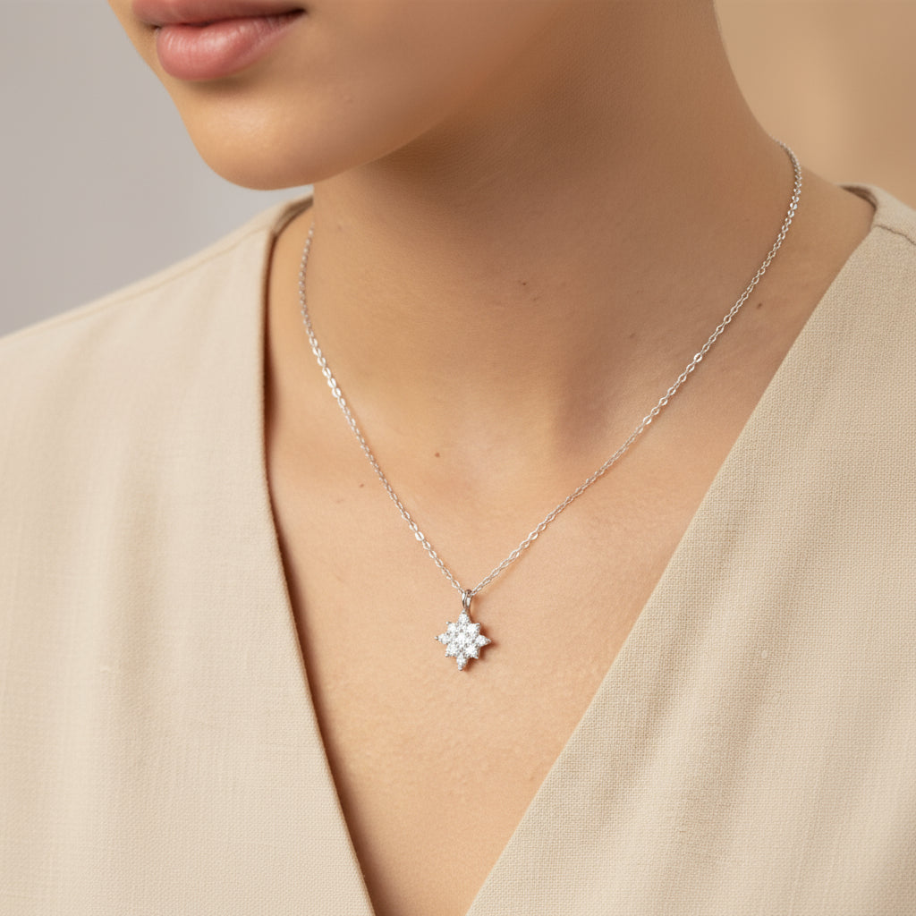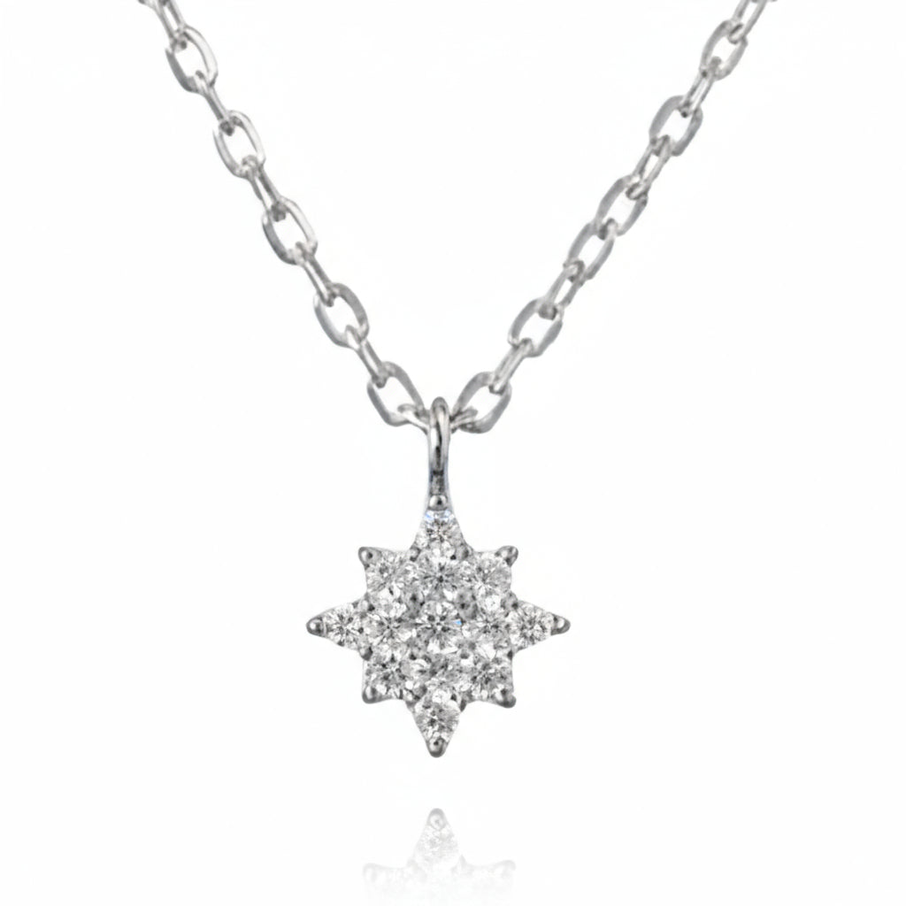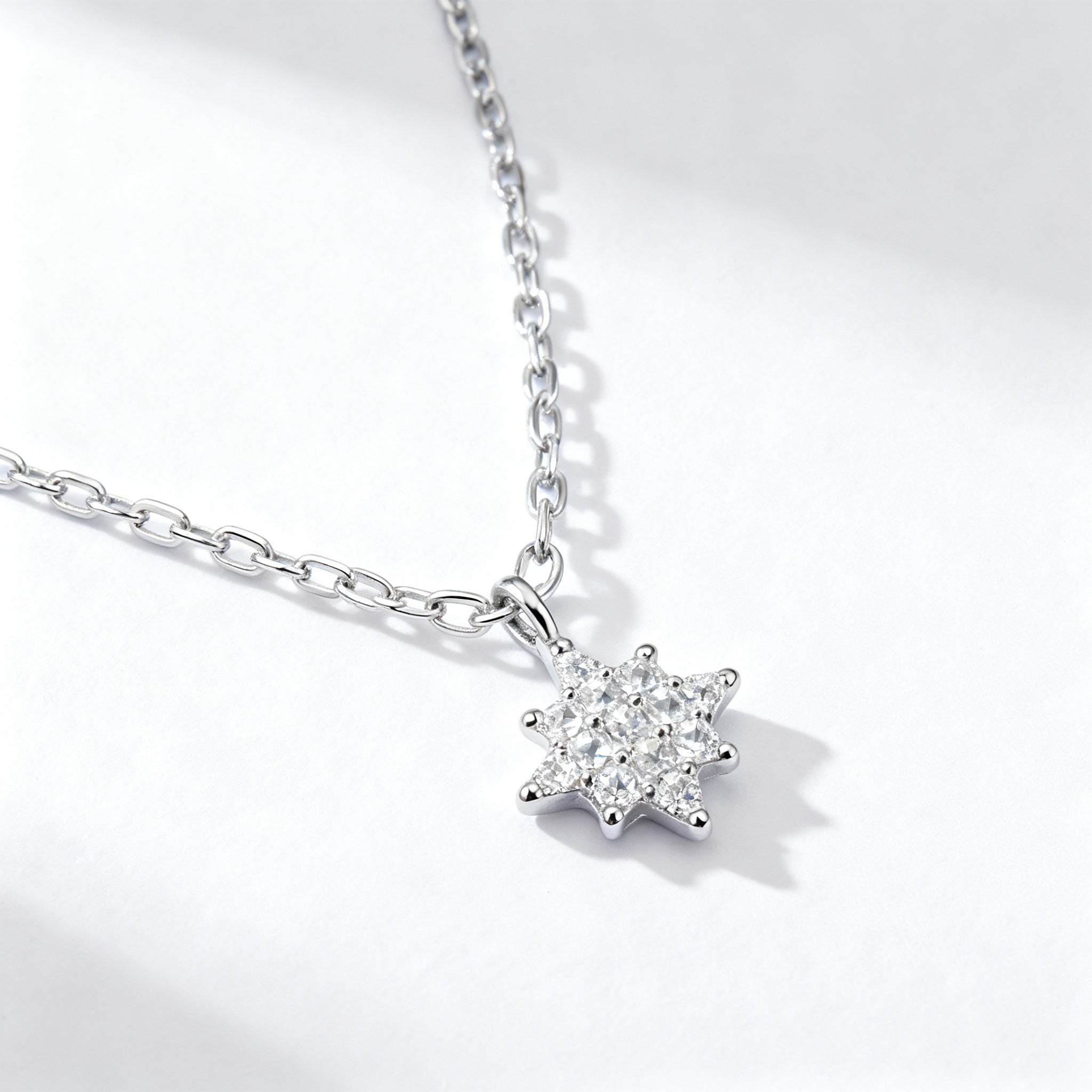 Shine bright with this elegant Star Pendant Necklace, designed to capture the beauty of the night sky. Crafted in high-quality sterling silver, the pendant features an eight-pointed star adorned with dazzling cubic zirconia stones that sparkle with every movement. The minimalist chain complements the pendant perfectly, offering a delicate yet timeless look.